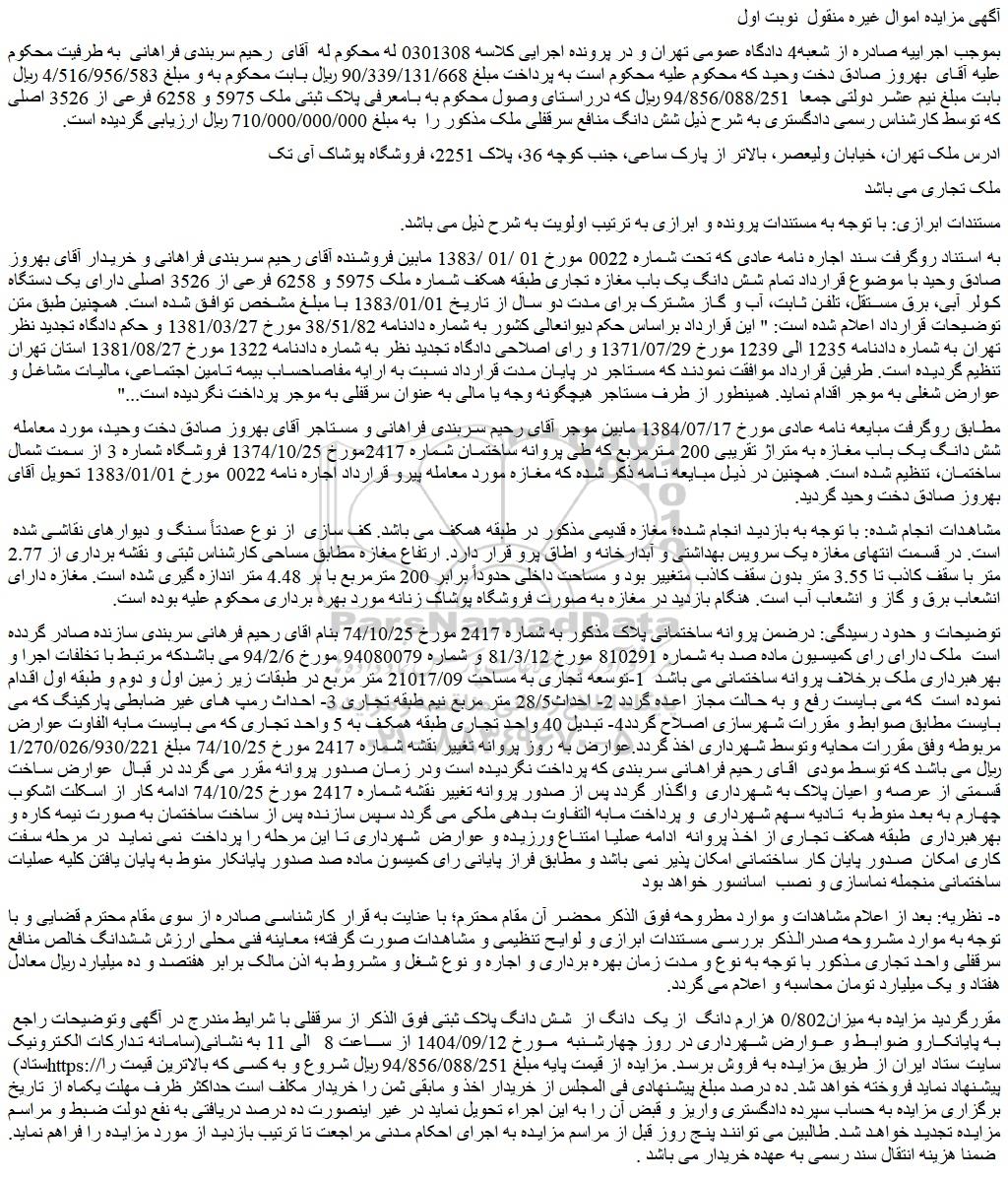 بموجب اجراییه صادره از شعبه4 دادگاه عمومی تهران و در پرونده اجرایی کلاسه 0301308 له محکوم له  آقای  رحیم سربندی فراهانی  به طرفیت محکوم علیه آقای  بهروز صادق دخت وحید که محکوم علیه محکوم است به پرداخت مبلغ 90/339/131/668 ریال بابت محکوم به و مبلغ 4/516/956/583 ریال  بابت مبلغ نیم عشر دولتی جمعا  94/856/088/251 ریال که درراستای وصول محکوم به بامعرفی پلاک ثبتی ملک 5975 و 6258 فرعی از 3526 اصلی که توسط کارشناس رسمی دادگستری به شرح ذیل شش دانگ منافع سرقفلی ملک مذکور را  به مبلغ 710/000/000/000 ریال ارزیابی گردیده است.