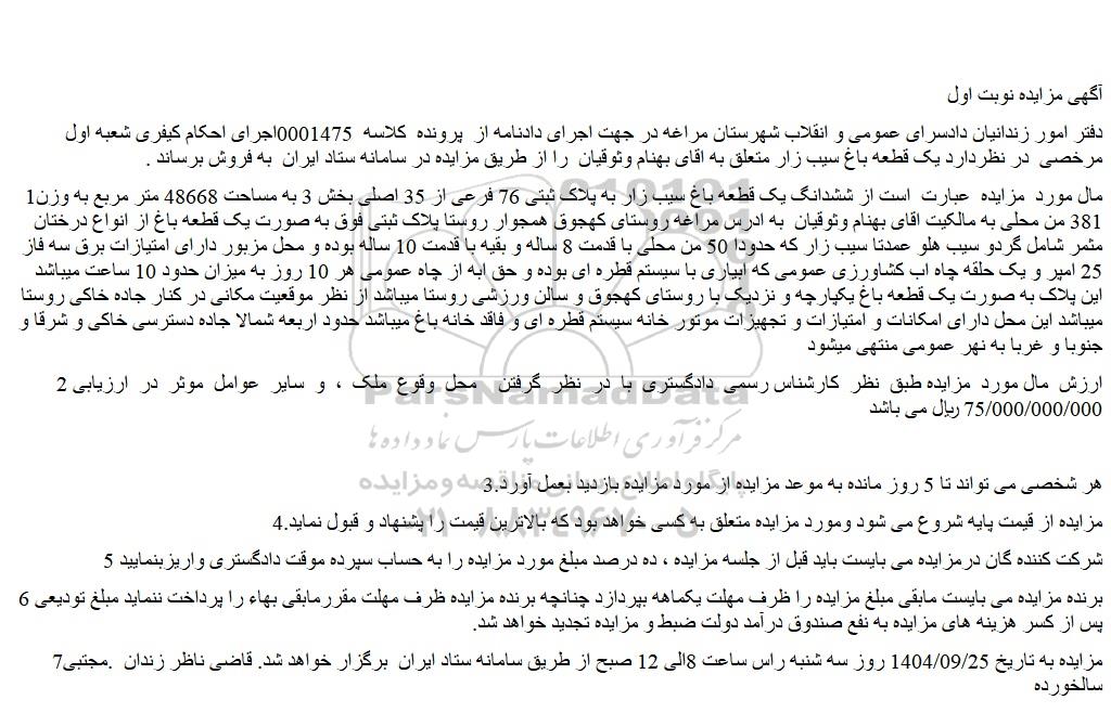 دفتر امور زندانیان دادسرای عمومی و انقلاب شهرستان مراغه در جهت اجرای دادنامه از پرونده کلاسه 0001475اجرای احکام کیفری شعبه اول مرخصی در نظردارد یک قطعه باغ سیب زار متعلق به اقای بهنام وثوقیان را از طریق مزایده در سامانه ستاد ایران به فروش برساند .