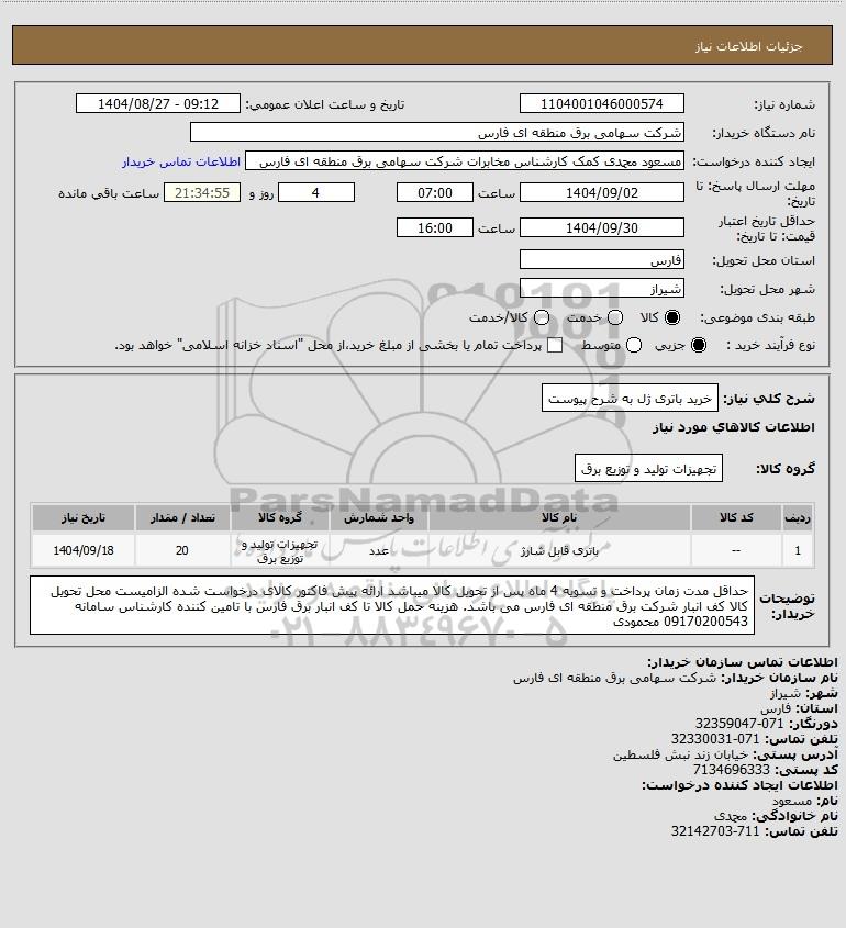 | 1 | -- | باتری قابل شارژ | عدد | تجهیزات تولید و توزیع برق | 20 | 1404/09/18 |