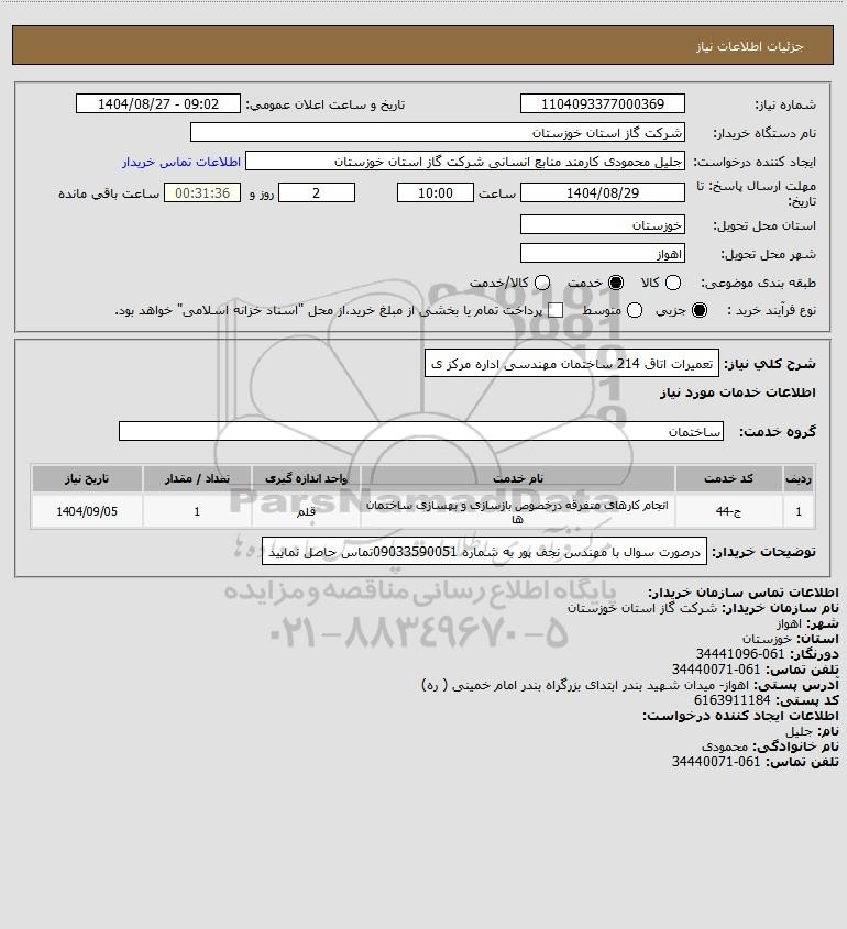شرح کلی نیاز: تعمیرات اتاق 214 ساختمان مهندسی اداره مرکز ی