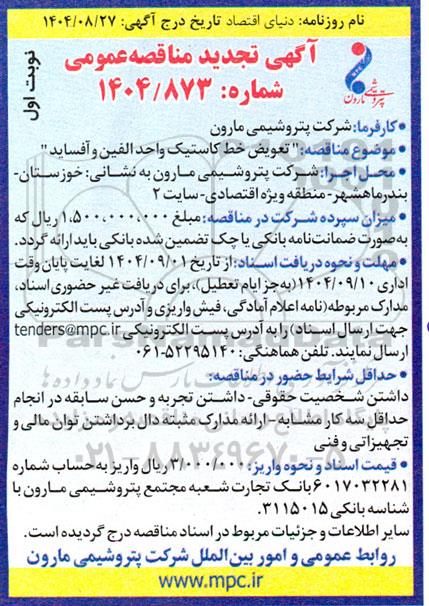 تجدید مناقصه تعویض خط کاستیک واحد الفین و آفساید از کلیه افراد متخصص و شرکتها واجد شرایط دعوت به عمل میآید در مناقصه با کد خبرگزاری پارس نماد: 9870118 شرکت نمایند.