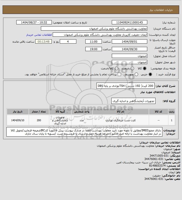 شرح کلی نیاز: 200 کیت( 192 تستی) TSHنوزادی بر پایه DBS