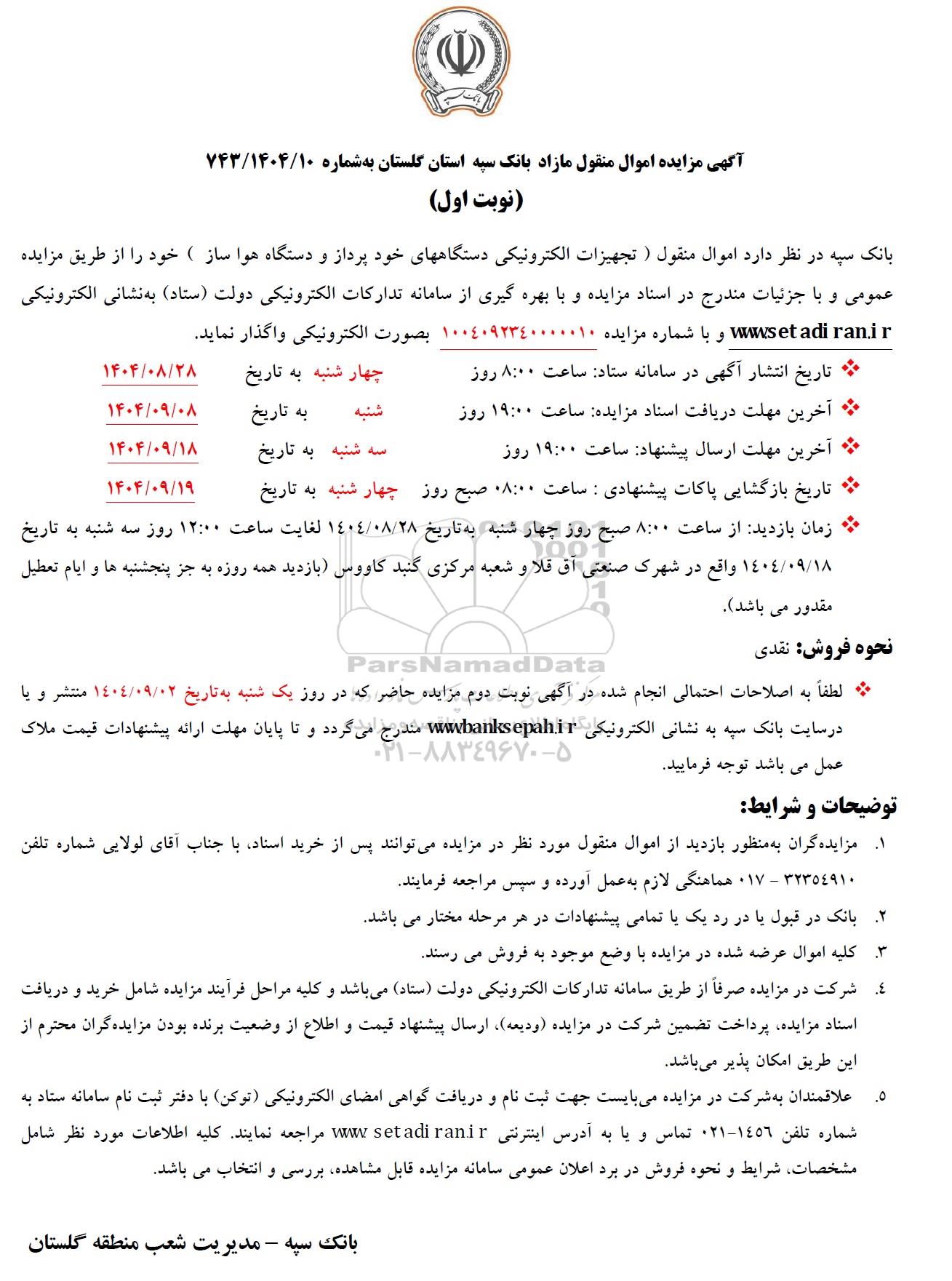 آگهی مزایده اموال منقول مازاد بانک سپه استان گلستان به شماره 743/1404/10 نوبت اول