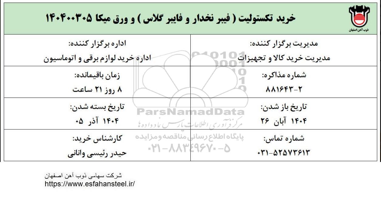 استعلام بها و موضوع استعلام استعلام تکستولیت ( فیبر نخدار و فایبر گلاس ) به اطلاع کلیه شرکتها و افراد متخصص واجد شرایط میرساند، آگهی گذار در نظر دارد از طریق استعلام بها، نسبت به انتخاب و دریافت پیشنهادات اقدام نماید. این استعلام با کد آگهی ثبت شده در سامانه خبرگزاری پارس نماد : 9872165 منتشر شده است. مشخصات استعلام : تاریخ شروع استعلام: 1404/08/27 آخرین مهلت ارسال پیشنهاد قیمت : 1404/09/05 و محل اجرای پروژه : استان مناقصات استان اصفهان میباشد. استعلام قیمت مورد درخواست : استعلام تکستولیت ( فیبر نخدار و فایبر گلاس ) با دستهبندیهای تخصصی و گروه های مرتبط : انواع عایق های رطوبتی ،حرارتی ،صوتی, ساخت،نصب و تعمیرات صنایع فولاد, قطعات فایبرگلاس, تجهیزات و ماشین آلات صنعتی, تجهیزات برق و الکترونیک, استعلام اطلاع رسانی میگردد.