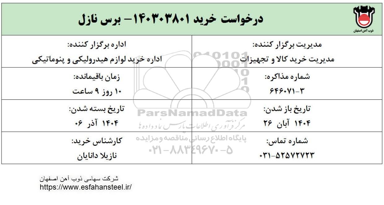 استعلام بها و موضوع استعلام استعلام برس نازل به اطلاع کلیه شرکتها و افراد متخصص واجد شرایط میرساند، آگهی گذار در نظر دارد از طریق استعلام بها، نسبت به انتخاب و دریافت پیشنهادات اقدام نماید. این استعلام با کد آگهی ثبت شده در سامانه خبرگزاری پارس نماد : 9872167 منتشر شده است. مشخصات استعلام : تاریخ شروع استعلام: 1404/08/27 آخرین مهلت ارسال پیشنهاد قیمت : 1404/09/06 و محل اجرای پروژه : استان مناقصات استان اصفهان میباشد. استعلام قیمت مورد درخواست : استعلام برس نازل با دستهبندیهای تخصصی و گروه های مرتبط : ابزار و یراق آلات, صنایع ریخته گری, ساخت،نصب و تعمیرات صنایع فولاد, تجهیزات و ماشین آلات صنعتی, استعلام اطلاع رسانی میگردد.