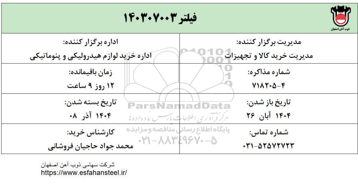 استعلام بها و موضوع استعلام استعلام فیلتر به اطلاع کلیه شرکتها و افراد متخصص واجد شرایط میرساند، آگهی گذار در نظر دارد از طریق استعلام بها، نسبت به انتخاب و دریافت پیشنهادات اقدام نماید. این استعلام با کد آگهی ثبت شده در سامانه خبرگزاری پارس نماد : 9872185 منتشر شده است. مشخصات استعلام : تاریخ شروع استعلام: 1404/08/27 آخرین مهلت ارسال پیشنهاد قیمت : 1404/09/08 و محل اجرای پروژه : استان مناقصات استان اصفهان میباشد. استعلام قیمت مورد درخواست : استعلام فیلتر با دستهبندیهای تخصصی و گروه های مرتبط : انواع فیلتر های تصفیه, ساخت،نصب و تعمیرات صنایع فولاد, تجهیزات و ماشین آلات صنعتی, استعلام اطلاع رسانی میگردد.