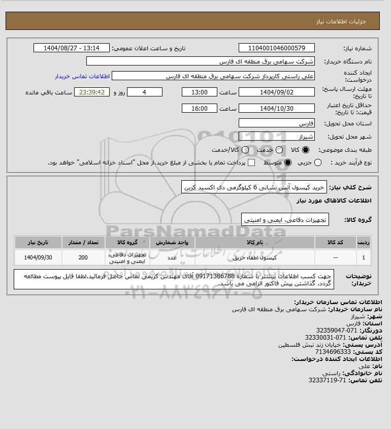 | 1 | -- | کپسول اطفاء حریق | عدد | تجهیزات دفاعی، ایمنی و امنیتی | 200 | 1404/09/30 |