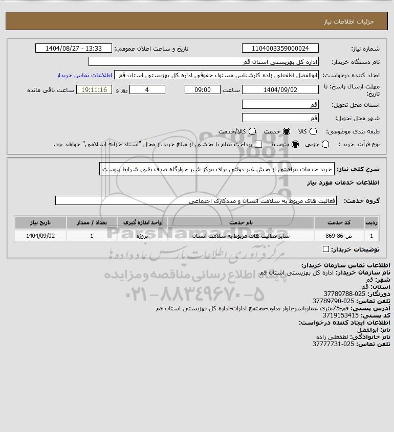 شرح کلی نیاز: خرید خدمات مراقبتی از بخش غیر دولتی برای مرکز شیر خوارگاه صدف طبق شرایط پیوست