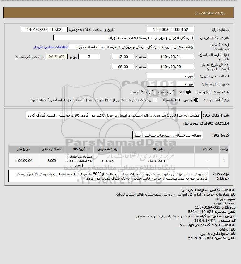 شرح کلی نیاز: کفپوش به متراژ5000 متر مربع دارای استاندارد تحویل در محل تاکید می گردد کالا درخواستی قیمت گذاری گردد