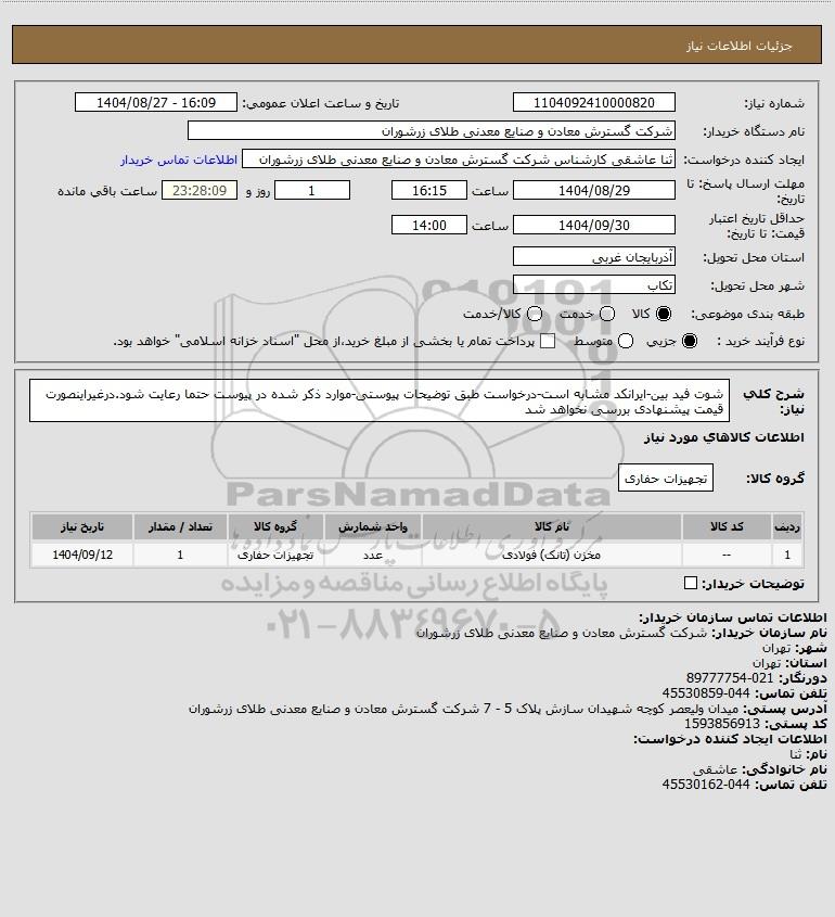 | 1 | -- | مخزن (تانک) فولادی | عدد | تجهیزات حفاری | 1 | 1404/09/12 |