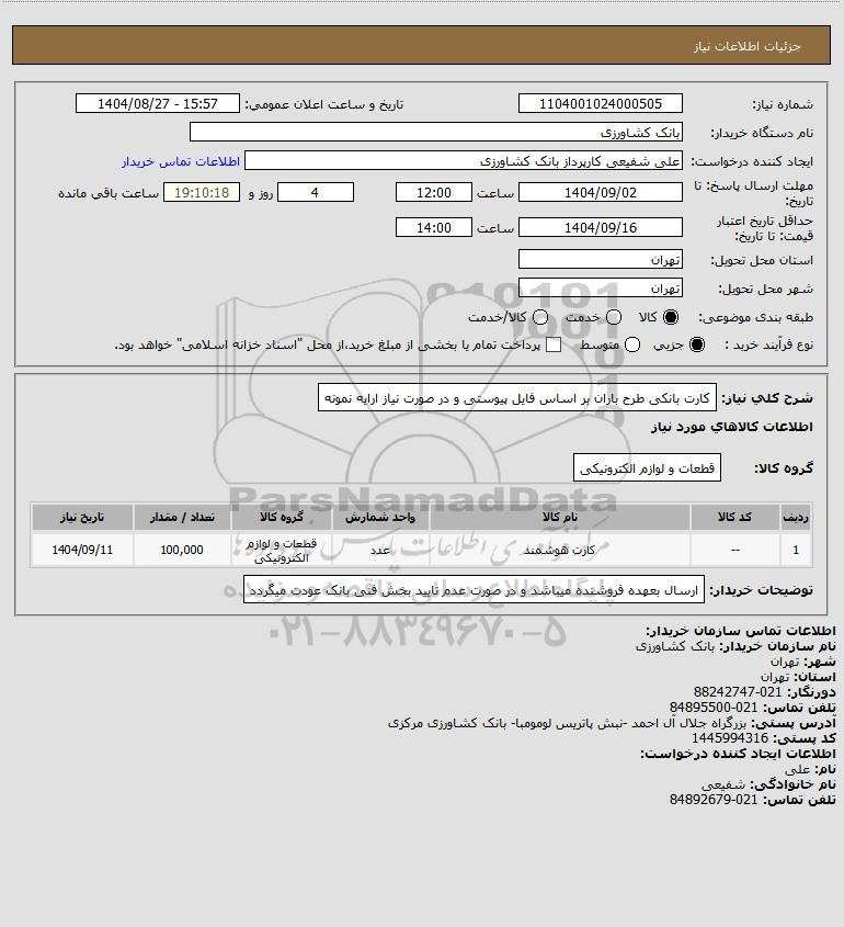 | 1 | -- | کارت هوشمند | عدد | قطعات و لوازم الکترونیکی | 100,000 | 1404/09/11 |
