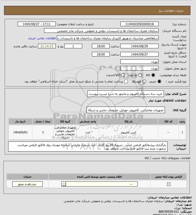 شرح کلی نیاز: خرید سه دستگاه کامپیوتر و مانیتور به شرح لیست پیوست