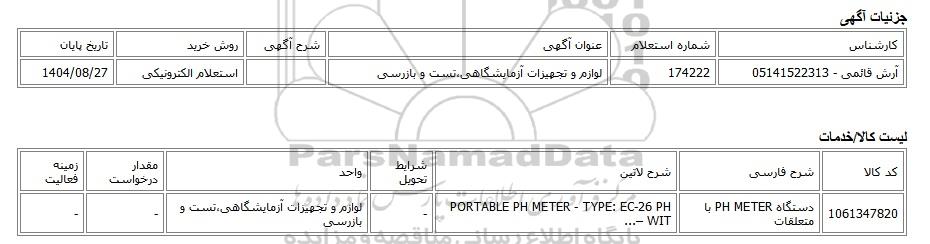 | آرش قائمی - 05141522313 | 174222 | لوازم و تجهیزات آزمایشگاهی،تست و بازرسی | استعلام الکترونیکی | 1404/08/27 |