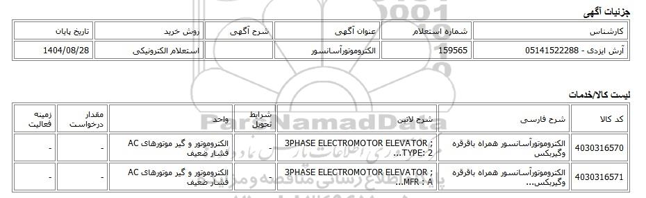| آرش ایزدی - 05141522288 | 159565 | الکتروموتورآسانسور | استعلام الکترونیکی | 1404/08/28 |