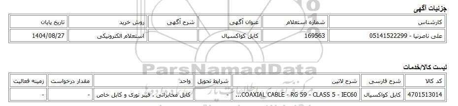 علی ناصرنیا - 05141522299169563کابل کواکسیالاستعلام الکترونیکی1404/08/27