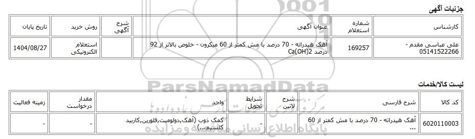 | علی عباسی مقدم - 05141522266 | 169257 | آهک هیدراته - 70 درصد با مش کمتر از 60 میکرون - خلوص بالاتر از 92 درصد Ca(OH)2 | استعلام الکترونیکی | 1404/08/27 |