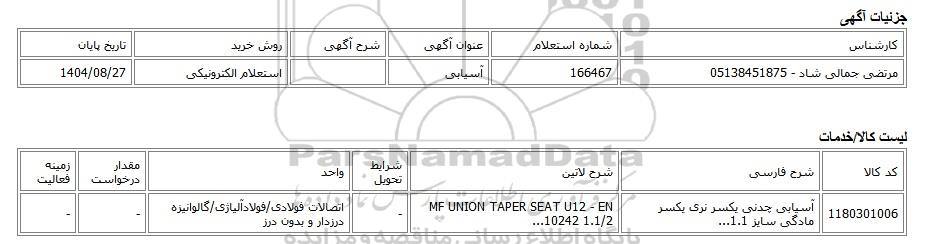 | مرتضی جمالی شاد - 05138451875 | 166467 | آسیابی | استعلام الکترونیکی | 1404/08/27 |