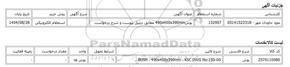 | محمد جاودان مهر - 05141522318 | 152957 | بوش490x400x390mm مطابق دیتیل پیوست و شرح درخواست | استعلام الکترونیکی | 1404/08/28 |
