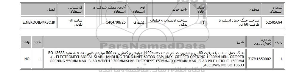 | 52505694 | ساخت چنگ حمل اسلب با ظرفیت 60 تن | 1 | ساخت تجهیزات و قطعات یدکی | کشوری | 1404/08/25 | عنایت اله نکوئی | E.NEKOOIE@KSC.IR |