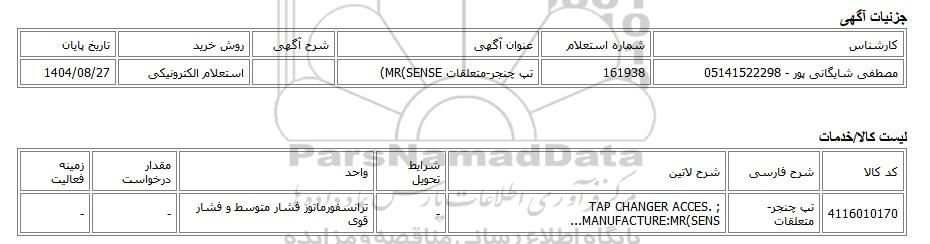 | مصطفی شایگانی پور - 05141522298 | 161938 | تپ چنجر-متعلقات MR(SENSE) | استعلام الکترونیکی | 1404/08/27 |