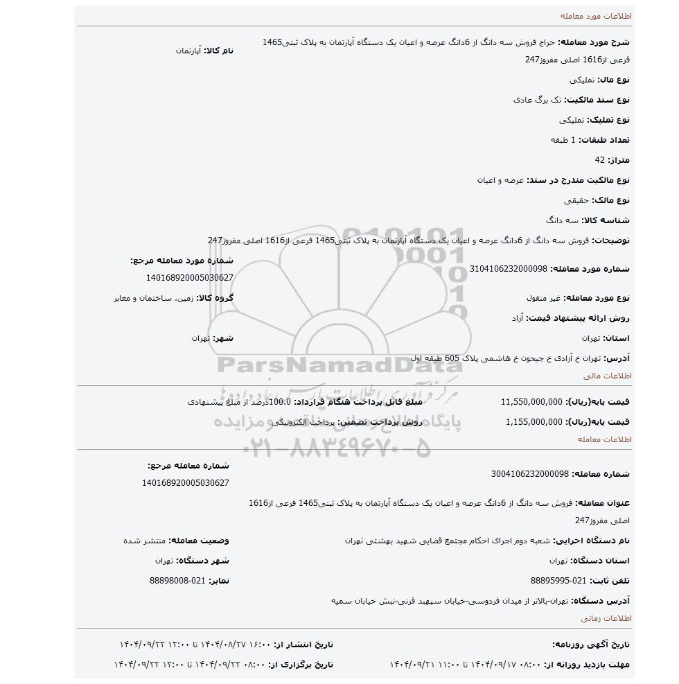 | شرح مورد معامله: حراج فروش سه دانگ از 6دانگ عرصه و اعیان یک دستگاه آپارتمان به پلاک ثبتی1465 فرعی از1616 اصلی مفروز247 | نام کالا: آپارتمان | |