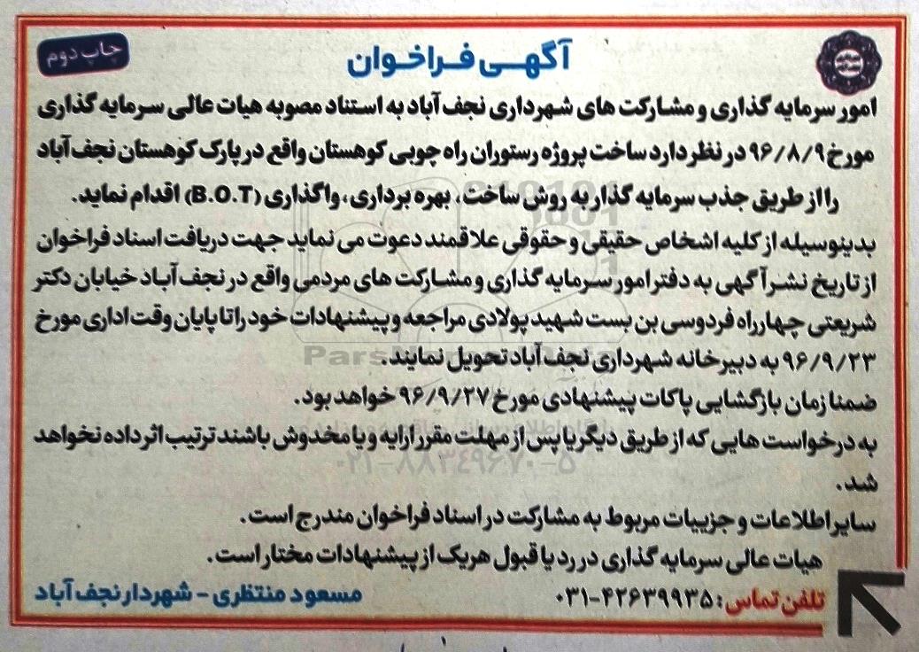 امور سرمایه گذاری و مشارکت های شهرداری نجف آباد به استناد مصوبه هیات عالی سرمایه گذاری مورخ 96.8.9در نظر دارد ساخت پروژه رستوران راه چوبی کوهستان واقع در پارک کوهستان نجف آباد را از طریق جذب سرمایه گذار به روش ساخت، بهره برداری، واگذاری (B.O.T) اقدام نماید.