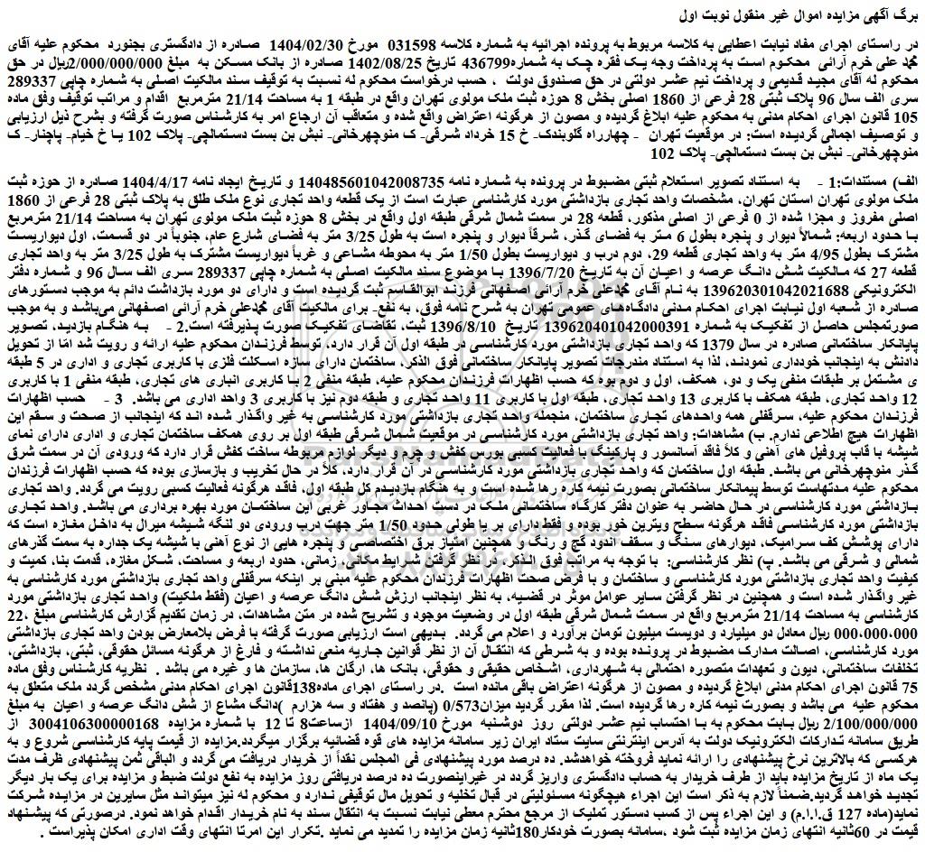 برگ آگهی مزایده اموال غیر منقول نوبت اول