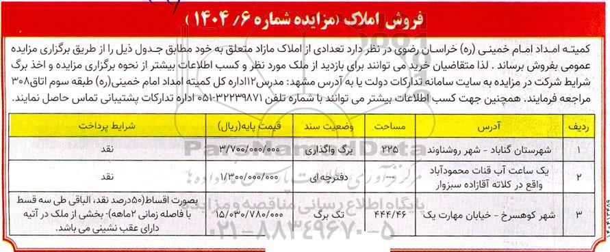 | 1 | شهرستان گناباد شهر روشناوند | 225 | برگ واگذاری | 3.700.000.000 | نقد |