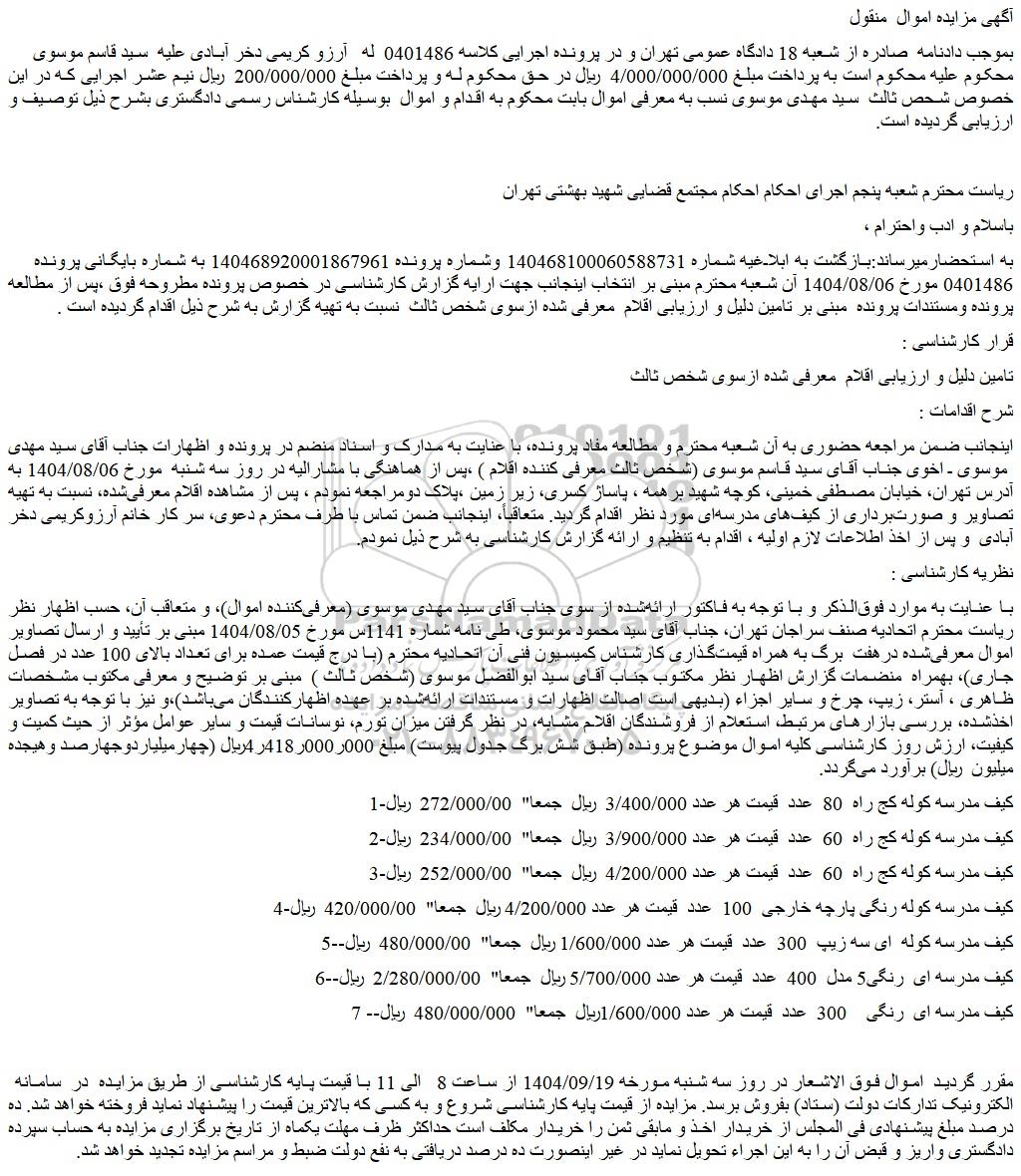 بموجب دادنامه صادره از شعبه 18 دادگاه عمومی تهران و در پرونده اجرایی کلاسه 0401486 له آرزو کریمی دخر آبادی علیه سید قاسم موسوی محکوم علیه محکوم است به پرداخت مبلغ 4/000/000/000 ریال در حق محکوم له و پرداخت مبلغ 200/000/000 ریال نیم عشر اجرایی که در این خصوص شحص ثالث سید مهدی موسوی نسب به معرفی اموال بابت محکوم به اقدام و اموال بوسیله کارشناس رسمی دادگستری بشرح ذیل توصیف و ارزیابی گردیده است.