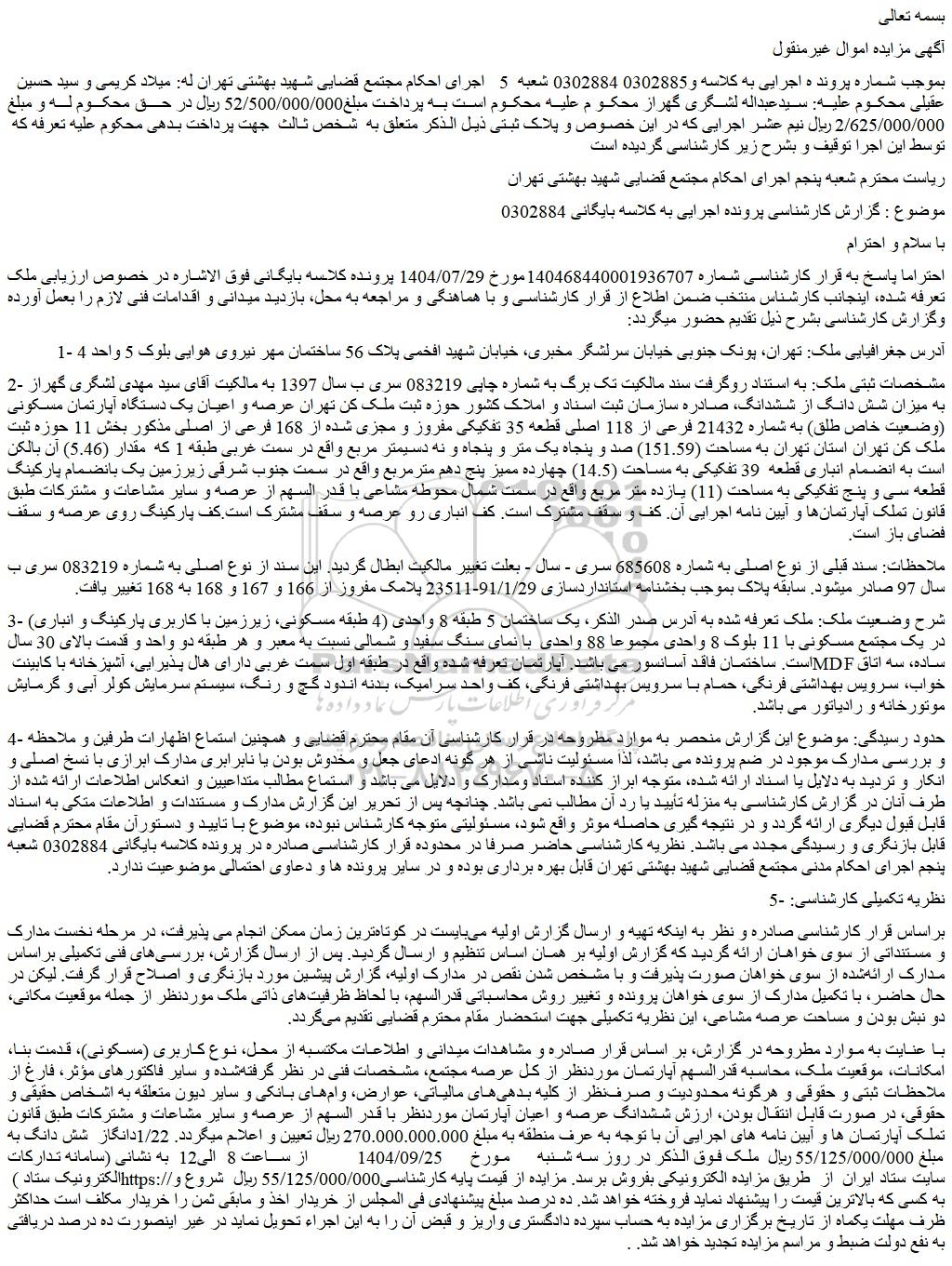بموجب شماره پروند ه اجرایی به کلاسه و0302885 0302884 شعبه 5 اجرای احکام مجتمع قضایی شهید بهشتی تهران له: میلاد کریمی و سید حسین عقیلی محکوم علیه: سیدعبداله لشگری گهراز محکو م علیه محکوم است به پرداخت مبلغ52/500/000/000 ریال در حق محکوم له و مبلغ 2/625/000/000 ریال نیم عشر اجرایی که در این خصوص و پلاک ثبتی ذیل الذکر متعلق به شخص ثالث جهت پرداخت بدهی محکوم علیه تعرفه که توسط این اجرا توقیف و بشرح زیر کارشناسی گردیده است