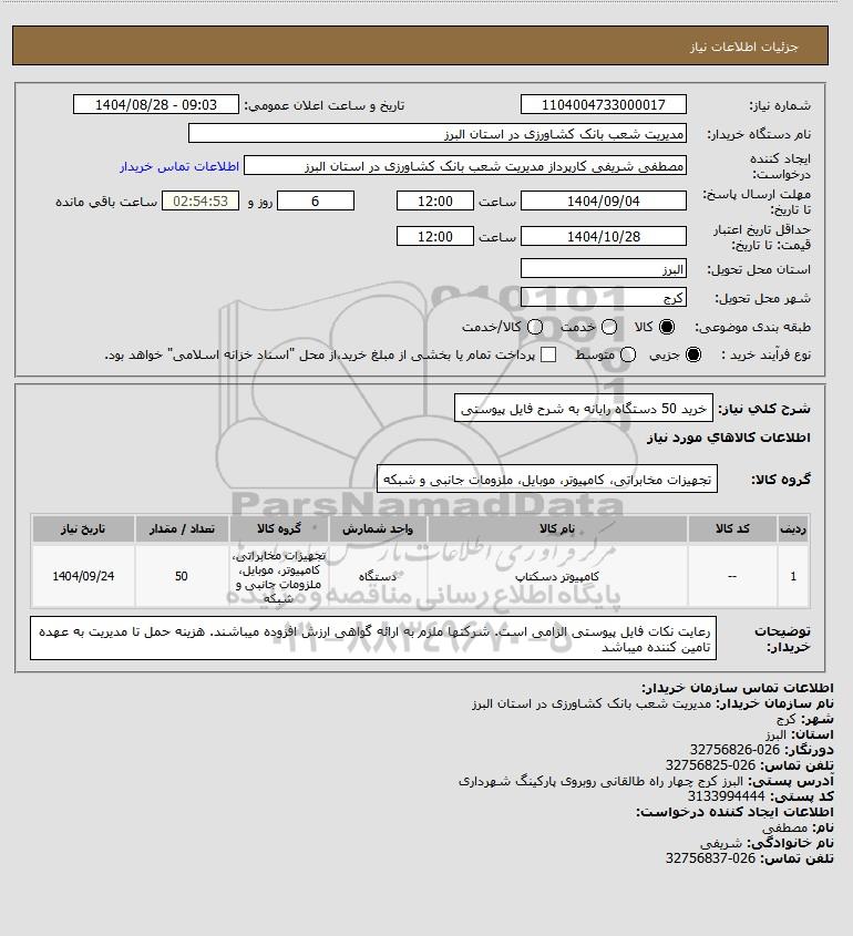 شرح کلی نیاز: خرید 50 دستگاه رایانه به شرح فایل پیوستی