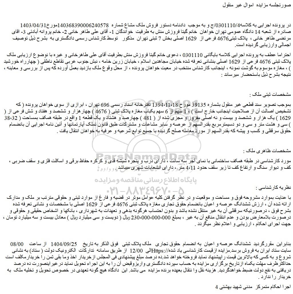 در پرونده اجرایی به کلاسه0301110/4/ج و به موجب دادنامه دستور فروش ملک مشاع شماره 140368390006240578مورخ1403/04/31 صادره از شعبه 14 دادگاه عمومی تهران خواهان خانم گیتا فروزش منش به طرفیت خواندگان 1- آقای علی طاهر خانی 2- خانم پروانه آبادئی 3- اقای مرتضی طاهر خانی ، پلاک ثبتی 4676 فرعی از 1629 اصلی بخش 7 ثبتی تهران مذکور توسط کارشناس رسمی دادگستری به بشرح ذیل توصیف اجمالی وارزیابی گردیده است.