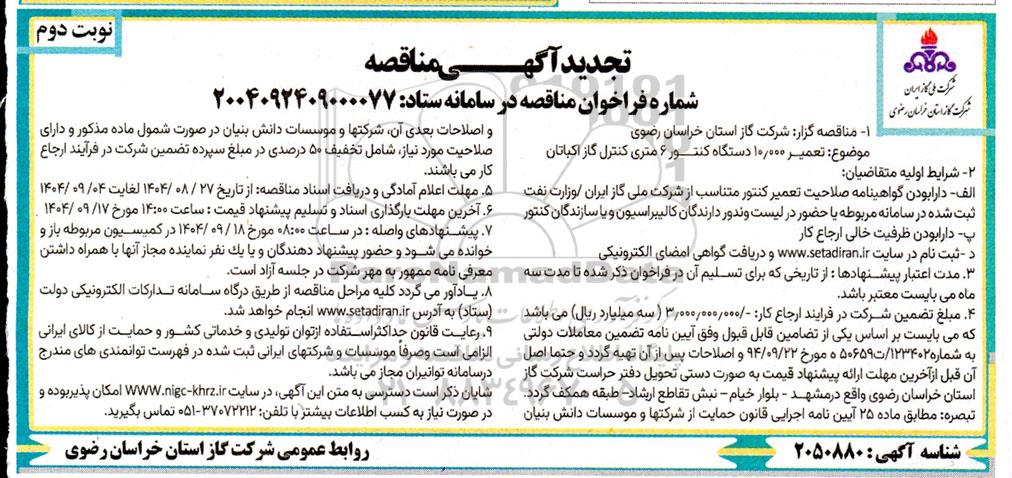 تجدید مناقصه تعمیر 10/000 دستگاه کنتور 6 متری کنترل گاز ... / نوبت دوم از کلیه افراد متخصص و شرکتها واجد شرایط دعوت به عمل میآید در مناقصه با کد خبرگزاری پارس نماد: 9876644 شرکت نمایند.