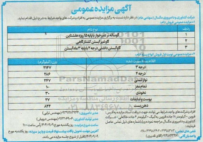 شرکت کشاورزی و دامپروری مگسال (سهامی عام) در نظر دارد نسبت به برگزاری مزایده عمومی به افراد و شرکت های واجد شرایط به شرح ذیل اقدام نماید: