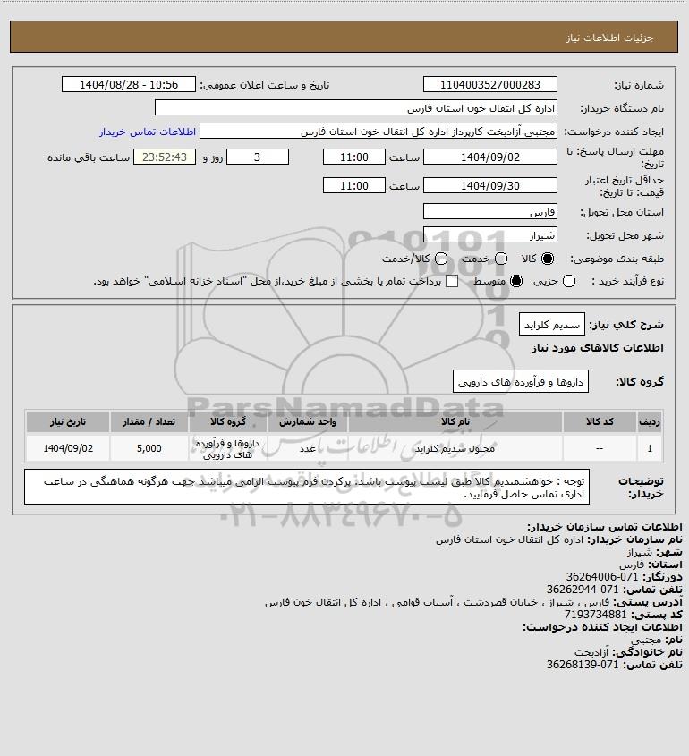 | 1 | -- | محلول سدیم کلراید | عدد | داروها و فرآورده های دارویی | 5,000 | 1404/09/02 |