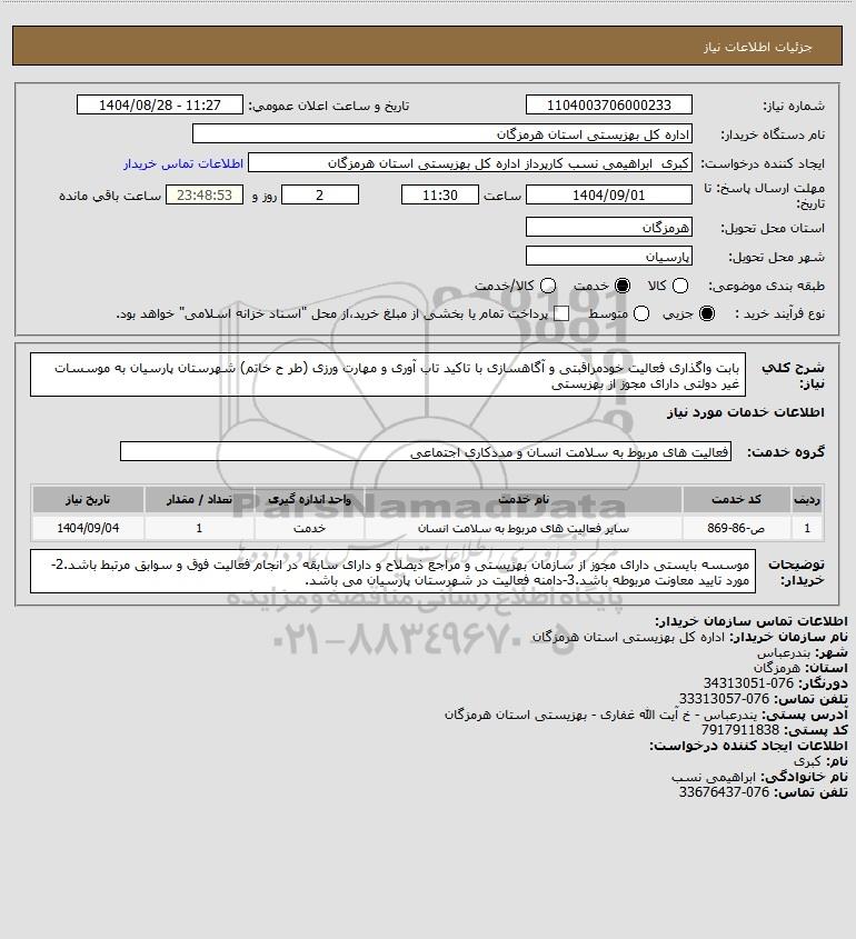 شرح کلی نیاز: بابت واگذاری فعالیت خودمراقبتی و آگاهسازی با تاکید تاب آوری و مهارت ورزی (طر ح خاتم) شهرستان پارسیان به موسسات غیر دولتی دارای مجوز از بهزیستی