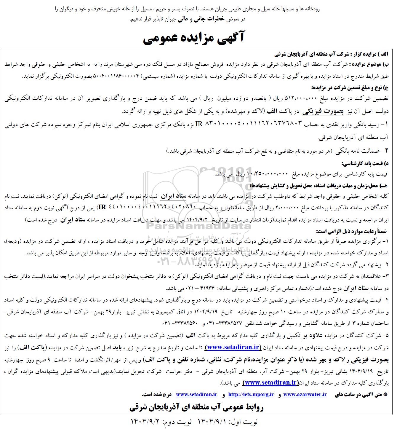 ب) موضوع مزایده: شرکت آب منطقه ای آذربایجان شرقی در نظر دارد مزایده فروش مصالح مازاد در مسیل فلک دره سی شهرستان مرند را به به اشخاص حقیقی و حقوقی واجد شرایط طبق شرایط مندرج در اسناد مزایده و با بهره گیری از سامانه تدارکات الکترونیکی دولت با شماره مزایده شماره سیستمی 5004001186000004 بصورت الکترونیکی برگزار نماید.
