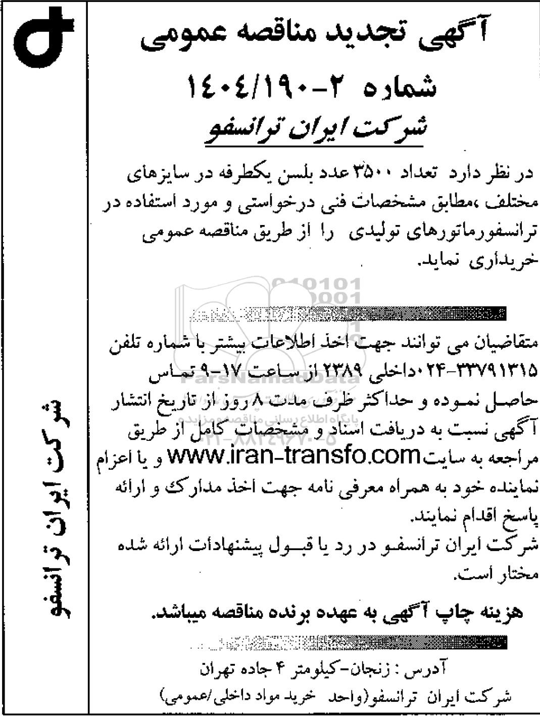 در نظر دارد تعداد 3500 عدد بلسن یکطرفه در سایزهای مختلف، مطابق مشخصات فنی درخواستی و مورد استفاده در ترانسفورماتورهای تولیدی را از طریق مناقصه عمومی خریداری نماید.
