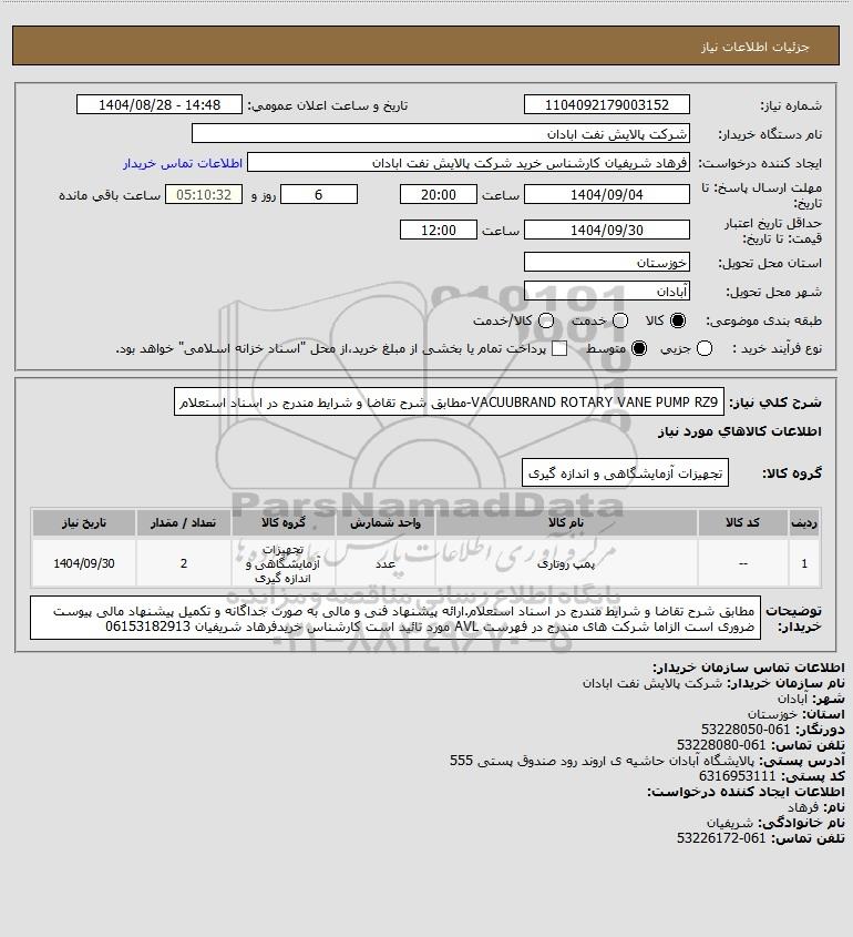 شرح کلی نیاز: VACUUBRAND ROTARY VANE PUMP RZ9-مطابق شرح تقاضا و شرایط مندرج در اسناد استعلام