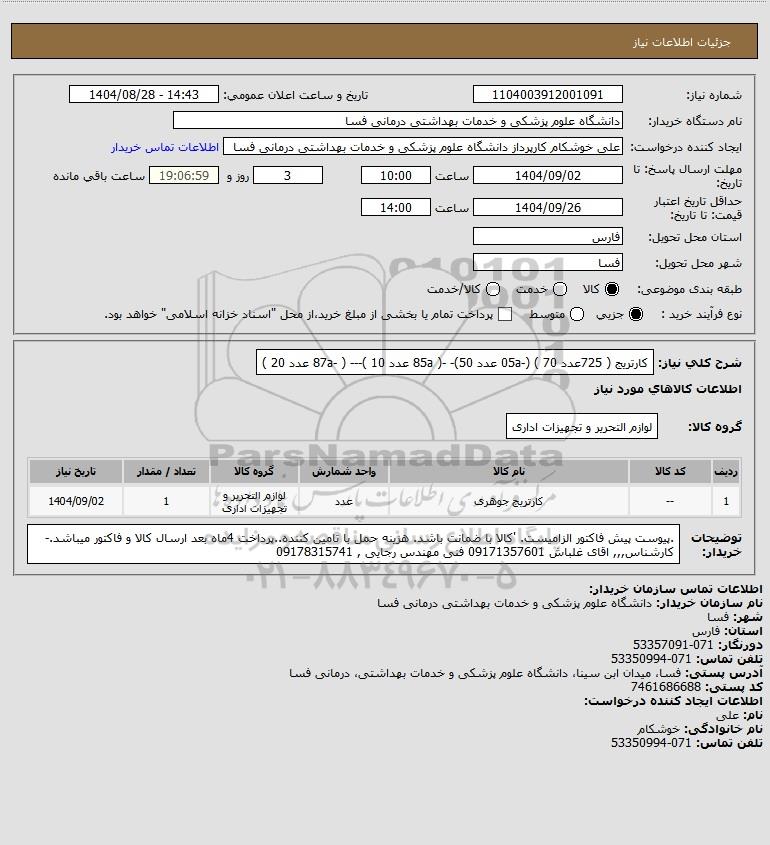 | 1 | -- | کارتریج جوهری | عدد | لوازم التحریر و تجهیزات اداری | 1 | 1404/09/02 |