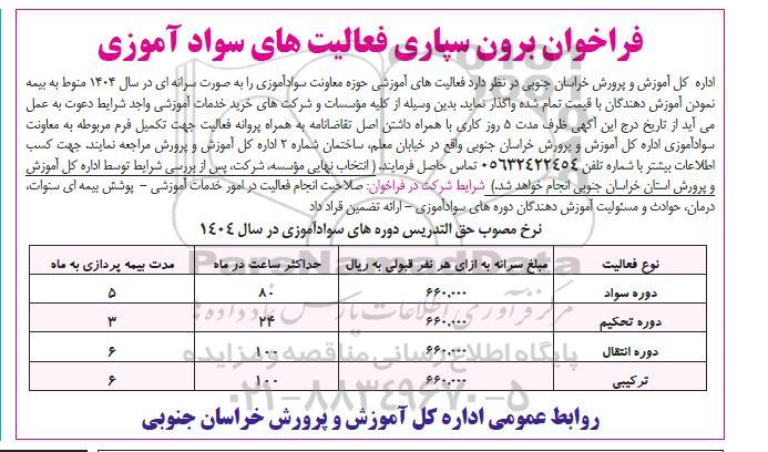 اداره کل آموزش و پرورش خراسان جنوبی در نظر دارد فعالیتهای آموزشی حوزه معاونت سواد آموزی را به صورت سرانه ای در سال 1404 منوط به بیمه نمودن آموزش دهندگان با قیمت تمام شده واگذار نماید. بدین وسیله از کلیه مؤسسات و شرکتهای خرید خدمات آموزشی واجد شرایط دعوت به عمل می آید از تاریخ درج این آگهی ظرف مدت 5 روز کاری با همراه داشتن اصل تقاضانامه به همراه پروانه فعالیت جهت تکمیل فرم مربوطه به معاونت سواد آموزی اداره کل آموزش و پرورش خراسان جنوبی واقع در خیابان معلم ساختمان شماره 2 اداره کل آموزش و پرورش مراجعه نمایند. جهت کسب اطلاعات بیشتر با شماره تلفن 05632422454 تماس حاصل فرمایند ( انتخاب نهایی مؤسسه شرکت پس از بررسی شرایط توسط اداره کل آموزش و پرورش استان خراسان جنوبی انجام خواهد شد) شرایط شرکت در فراخوان صلاحیت انجام فعالیت در امور خدمات آموزشی - پوشش بیمه ای سنوات درمان حوادث و مسئولیت آموزش دهندگان دوره های سواد آموزی - ارائه تضمین قراد داد