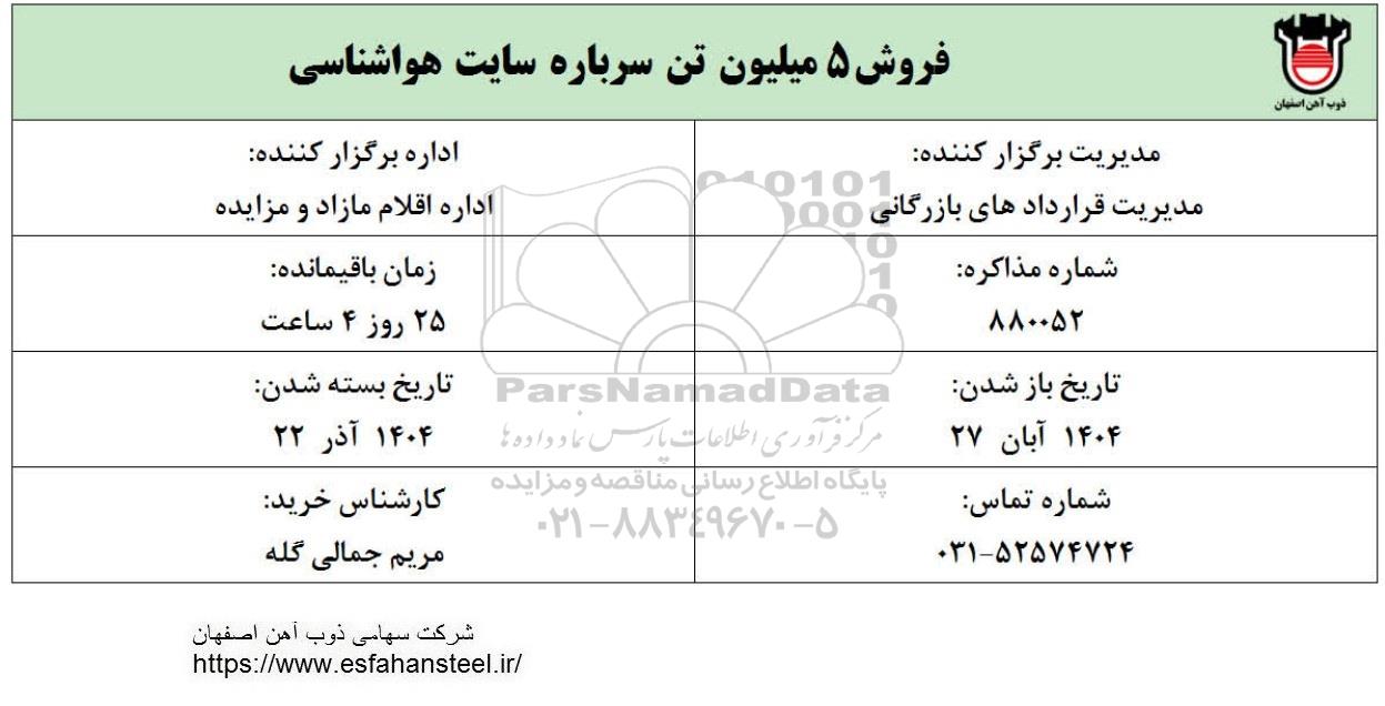 مزایده عمومی مزایده فروش 5 میلیون تن سرباره سایت هواشناسی برگزار میگردد. از کلیه افراد متخصص و شرکتهای واجد شرایط دعوت به عمل میآید تا در این مزایده با کد خبرگزاری پارس نماد : 9879683 شرکت نمایند تاریخ شروع مزایده : 1404/08/28 مهلت شرکت در مزایده: تا پایان روز 1404/09/22 مکان برگزاری اموال واگذاری استانهای مزایدات استان اصفهان و دستهبندیهای مربوط به این حراجی آهن آلات, معدن میباشد.