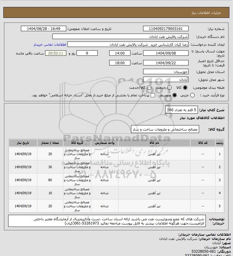استعلام بها و موضوع استعلام استعلام 5 قلم به تعداد 160 به اطلاع کلیه شرکتها و افراد متخصص واجد شرایط میرساند، آگهی گذار در نظر دارد از طریق استعلام بها، نسبت به انتخاب و دریافت پیشنهادات اقدام نماید. این استعلام با کد آگهی ثبت شده در سامانه خبرگزاری پارس نماد : 9879748 منتشر شده است. مشخصات استعلام : تاریخ شروع استعلام: 1404/08/28 آخرین مهلت ارسال پیشنهاد قیمت : 1404/09/08 و محل اجرای پروژه : استان مناقصات استان خوزستان میباشد. استعلام قیمت مورد درخواست : استعلام 5 قلم به تعداد 160 با دستهبندیهای تخصصی و گروه های مرتبط : آهن آلات, مصالح ساختمانی, استعلام اطلاع رسانی میگردد.