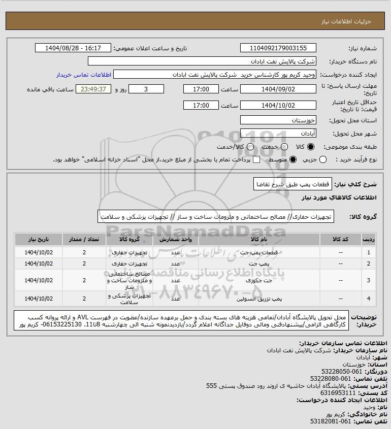 | 1 | -- | قطعات پمپ جت | عدد | تجهیزات حفاری | 2 | 1404/10/02 |