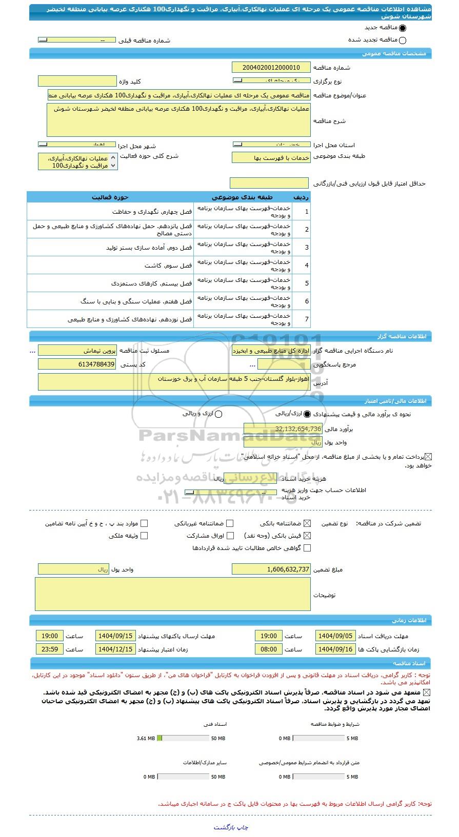 | شرح مناقصه | عملیات نهالکاری،آبیاری، مراقبت و نگهداری100 هکتاری عرصه بیابانی منطقه لخیضر شهرستان شوش | ||||||||||||||||||||||||||