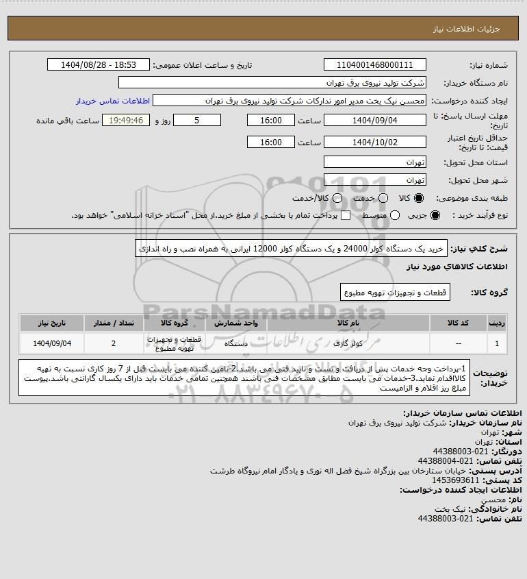 شرح کلی نیاز: خرید یک دستگاه کولر 24000 و یک دستگاه کولر 12000 ایرانی به همراه نصب و راه اندازی