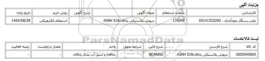 | علی رستگار محمدآبادی - 05141522292 | 176043 | درپوش پلاستیکی یاتاقانASNH 518 | استعلام الکترونیکی | 1404/08/28 |