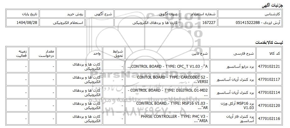 | آرش ایزدی - 05141522288 | 167227 | کارت ها و بردهای الکترونیکی | استعلام الکترونیکی | 1404/08/28 |