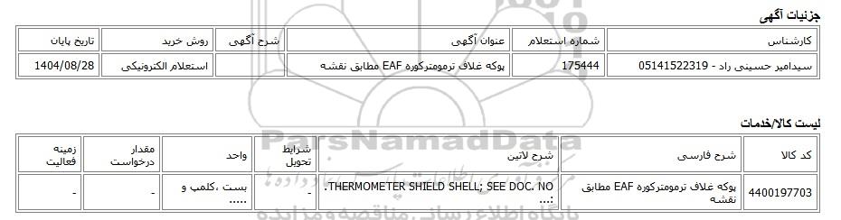 | سیدامیر حسینی راد - 05141522319 | 175444 | پوکه غلاف ترمومترکوره EAF مطابق نقشه | استعلام الکترونیکی | 1404/08/28 |
