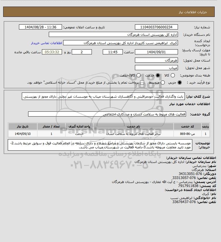 شرح کلی نیاز: بابت واگذاری فعالیت خودمراقبتی و آگاهسازی شهرستان میناب به موسسات غیر دولتی دارای مجوز از بهزیستی